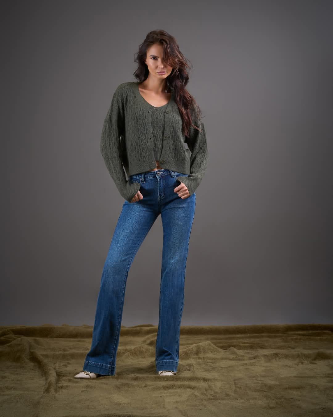 Die Jeans ist extra lang und endet mit einem breiten Saum